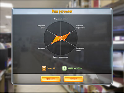 Товары или услуги, которые согласился приобрести клиент, в ходе диалога добавляются в корзину покупателя. После завершения взаимодействия выводится информация об успешно проданных товарах и услугах, с уточнением списка того, что можно было продать в потенциале. В результате пользователь зарабатывает игровые деньги.