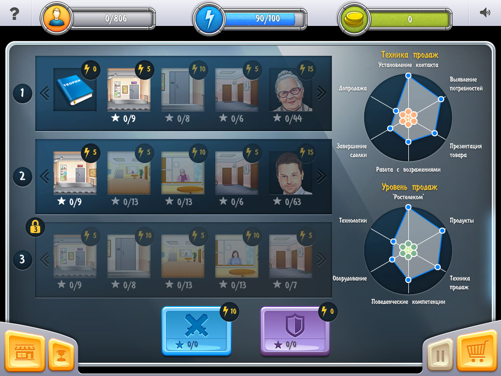 В игре оцениваются знания и навыки по технике продаж и уровню продаж. Знаний и навыки отображаются в диаграммах. Диаграммы развития навыков отображаются в главном меню игрока.